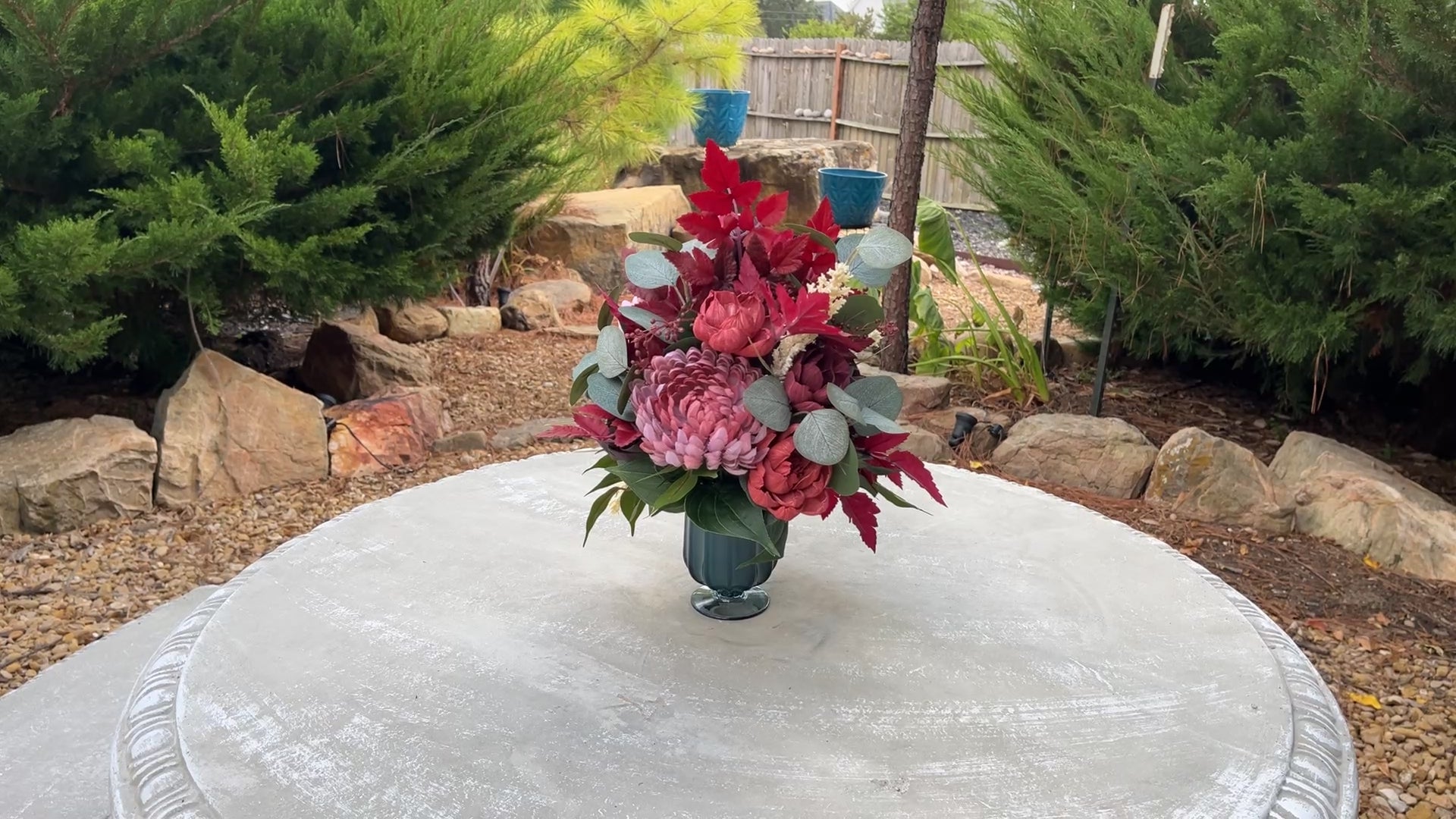 With layers of soft pink chrysanthemums, rosy blooms, and berry-toned foliage, Grateful radiates warmth and tenderness. Accented with creamy whites, deep burgundy, and velvety leaves, this piece feels both fresh and timeless.